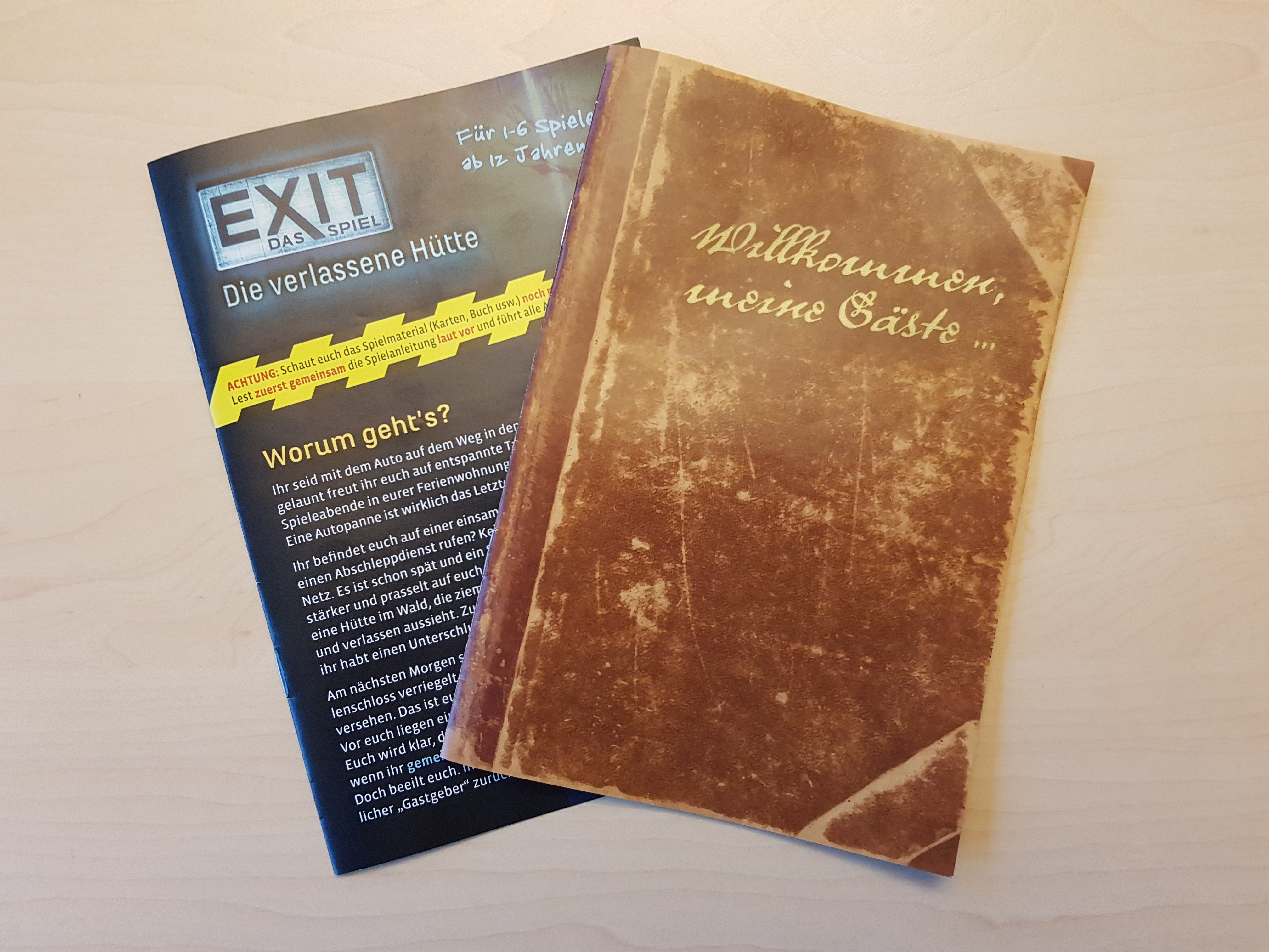 Exit Games erfreuen sich immer größerer Beliebtheit. Was lag also näher, diese Spielidee auch als Gesellschaftspiel für zuhause umzusetzen? Kosmos griff diesen Trend bereits 2016 auf und präsentierte zur damaligen Spiel `16 in Essen die ersten drei Sets. Exit Das Spiel – Die verlassene Hütte der Autoren Inka & Markus Brand ist eines dieser Sets, das in einer kompakten kleinen Box das komplette Spielmaterial in Form der Anleitung, eines Buches mit der Hintergrundgeschichte und den Rätseln, 86 Karten, einer Decodierscheibe und 3 Teilen liefert.