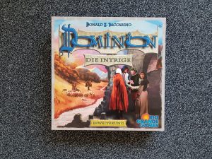 Bereits 2009 erschien Dominion – Die Intrige, das zunächst als eigenständiges Spiel ausgelegt war und daher neben den neuen Königreich- und Aktionskarten auch die Basiskarten in einem kompletten Satz von 500 Karten umfasste. Seit 2014 wird Die Intrige von Rio Grande Games in Deutschland nur noch als reine Erweiterung ohne Basiskarten vertrieben und ist daher nur in Kombination mit dem Grundspiel spielbar. Die Erweiterung umfasst 300 Karten, die wie gehabt in einer Box mit passendem Einleger untergebracht sind.