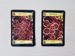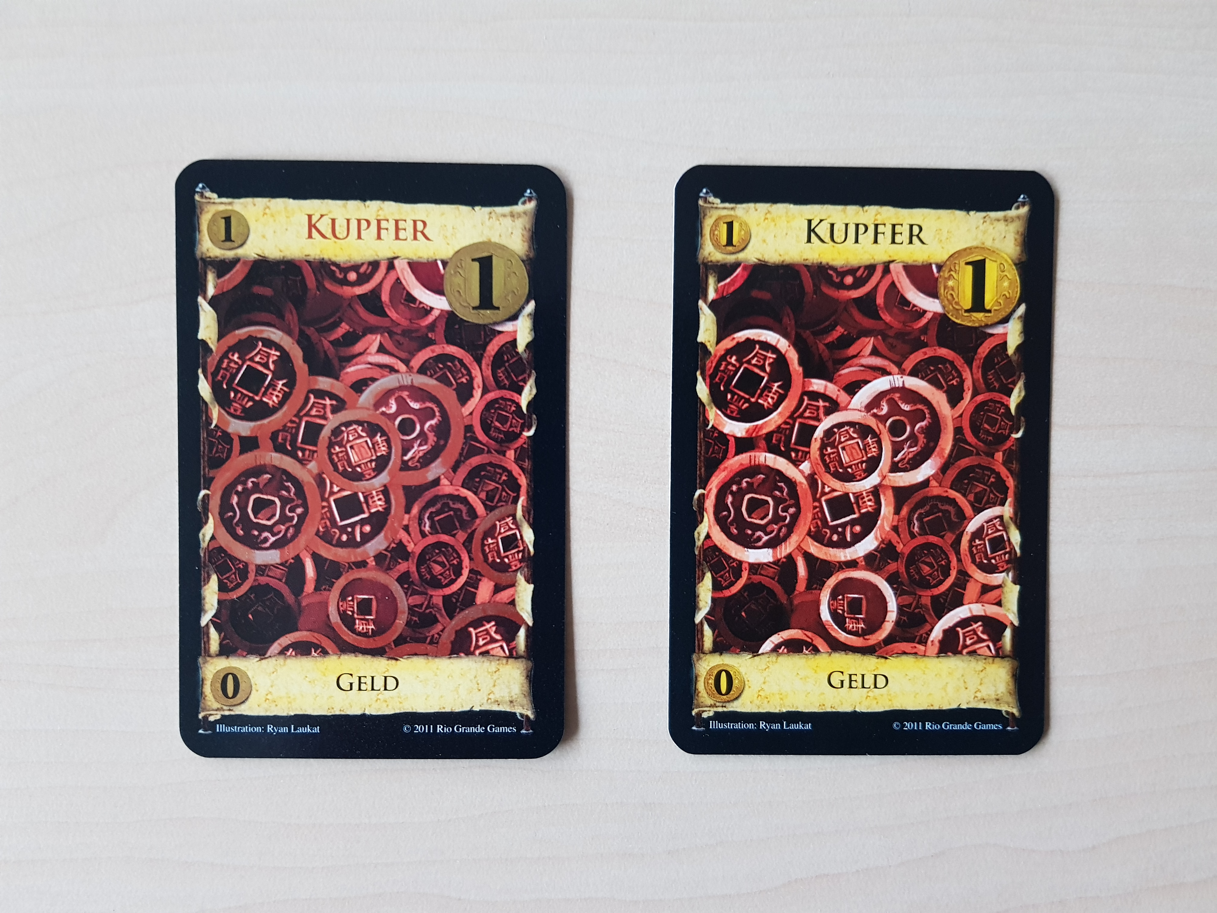 So umfasst sie 60 Kupfer-Karten, wovon 30 glanzveredelt sind. 40 Leerkarten, auch hier 20 glanzveredelt, geben den Spielern die Möglichkeit, eigene Kartenkreationen zu schaffen. Desweiteren sind noch 2 Ablagetableaus für eine Zweierpartie, 27 beschreibbare Trennkarten für diejenigen, die die Karten nach eigenem System sortieren, sowie eine kleine Reisebox, in der man sein Deck sicher unterbringen kann, enthalten.