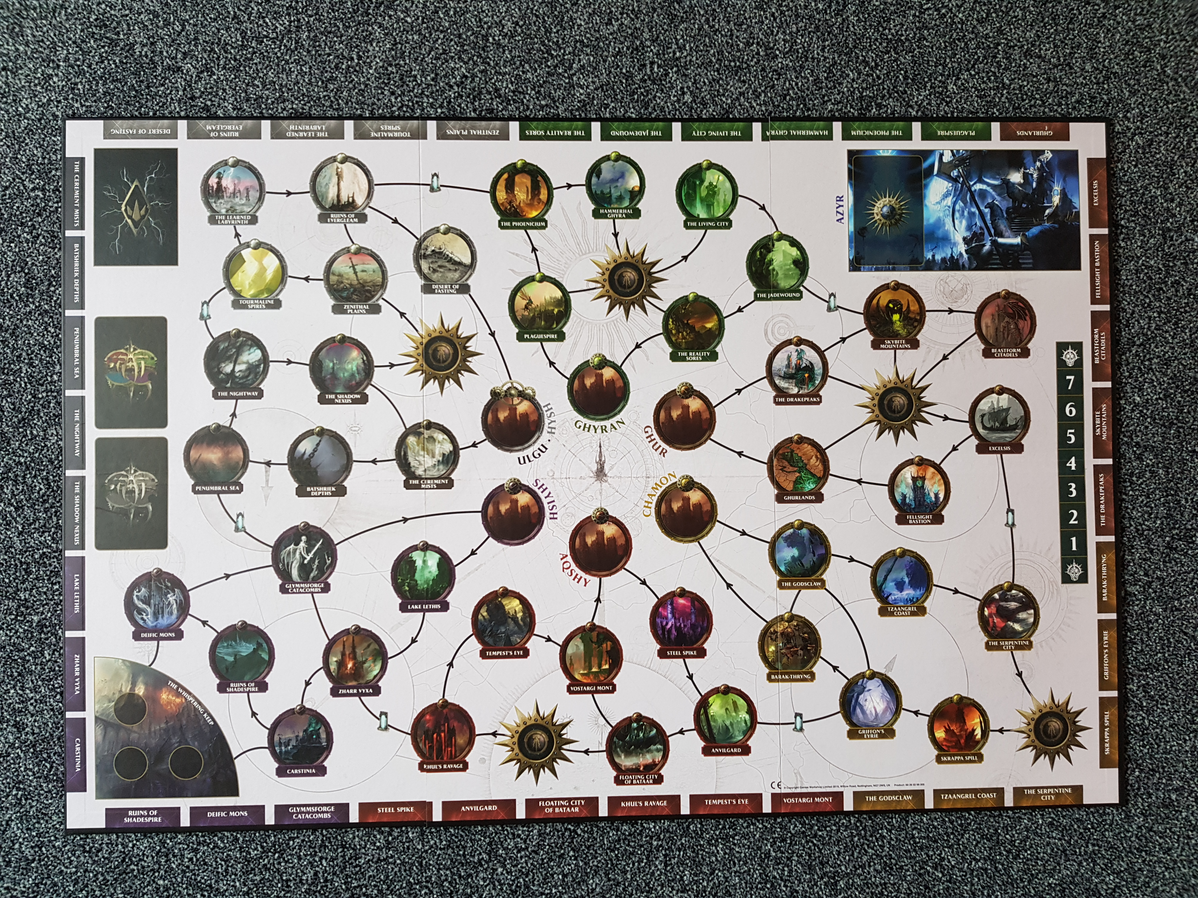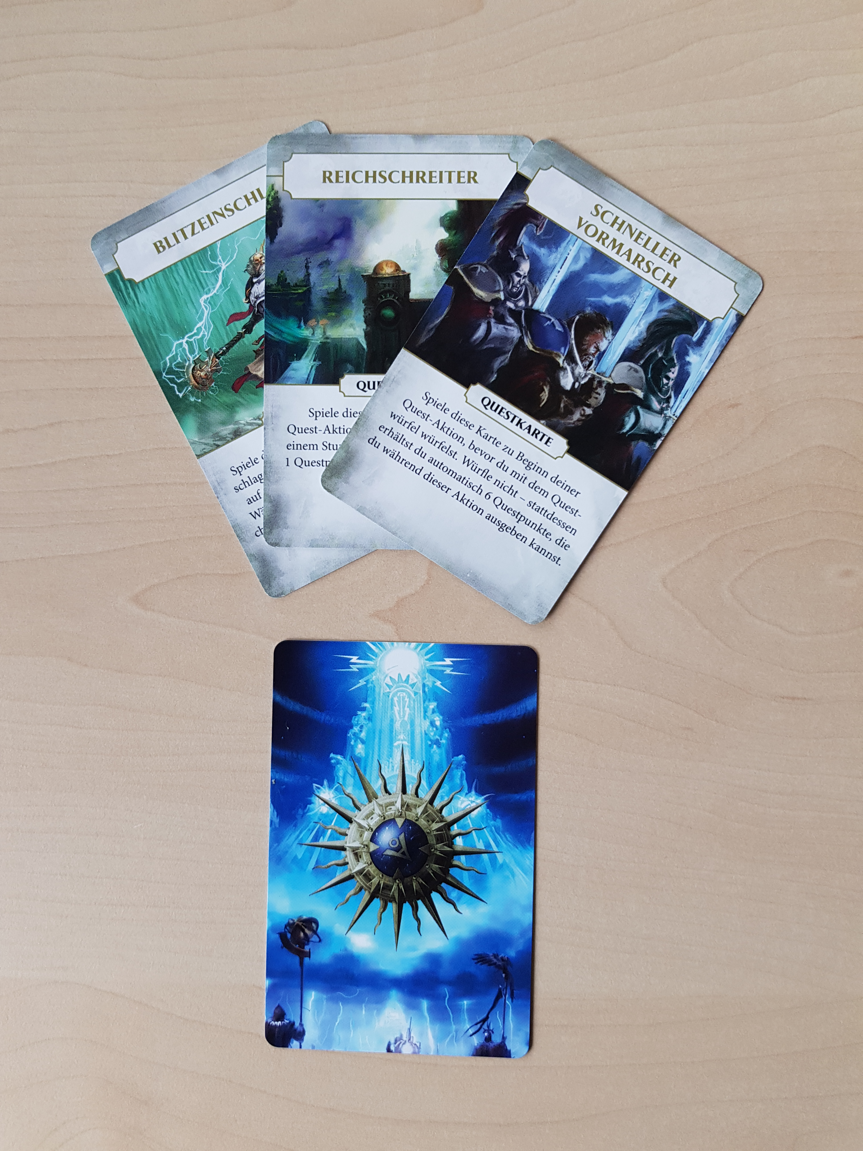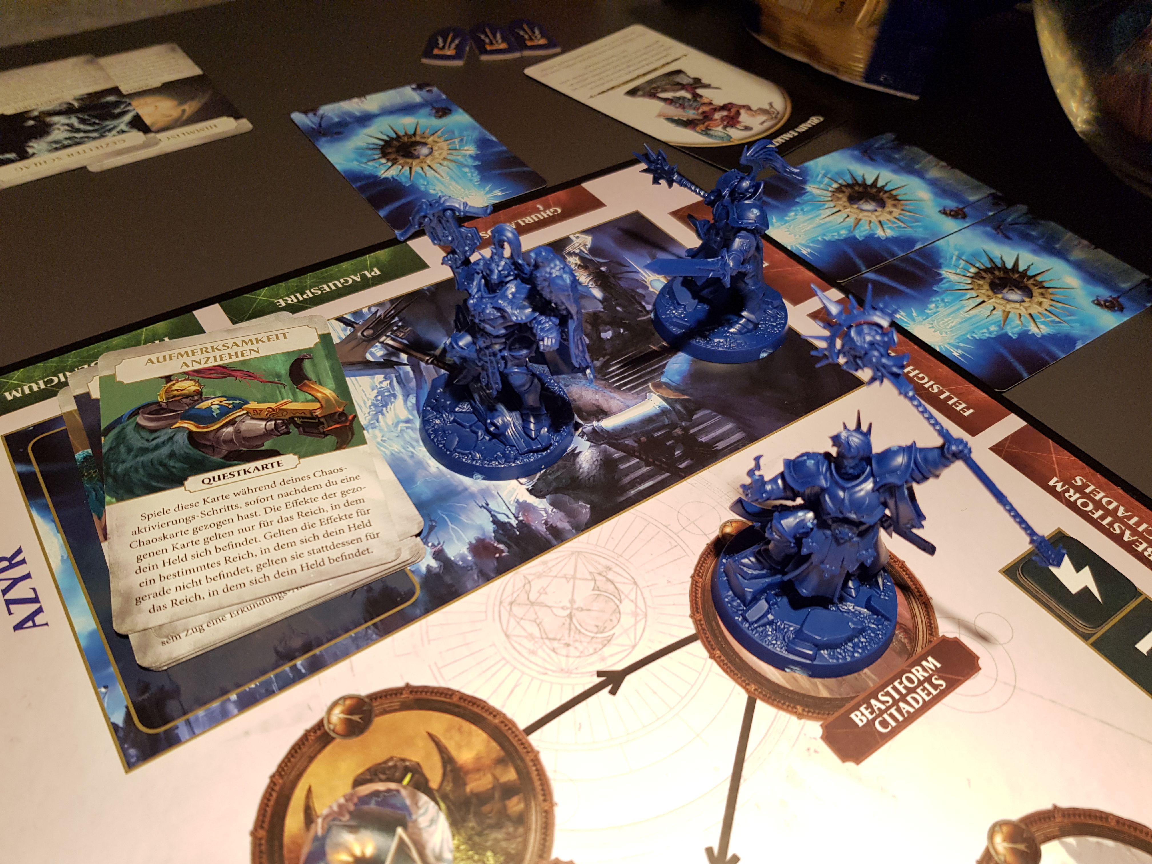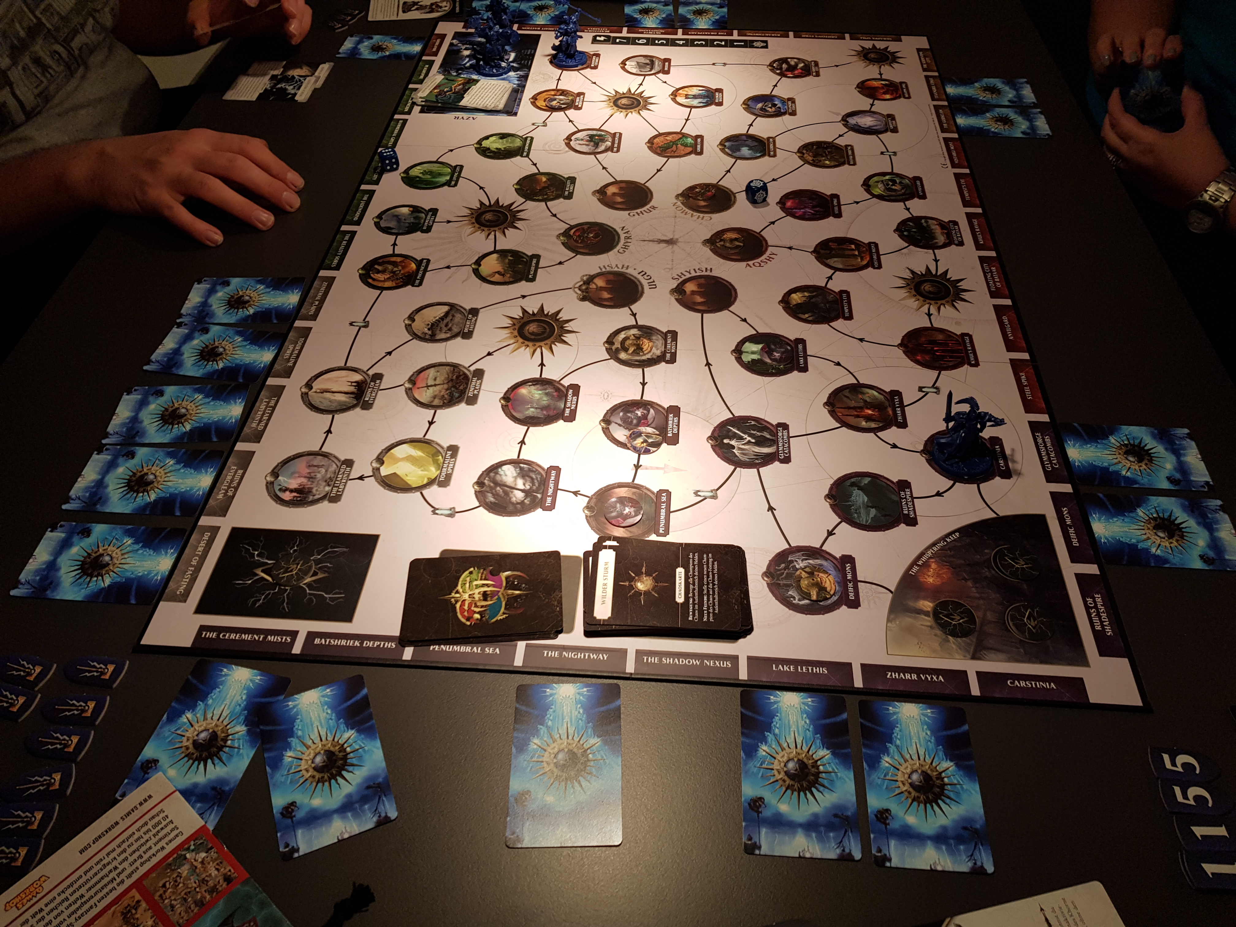 Vor der ersten Partie Storm Vault gilt es zunächst, die 6 Heldenminiaturen zusammenzubauen und ggf. zu bemalen. Zu Spielbeginn wird der Spielplan in der Tischmitte platziert, jeder der maximal 5 Spieler wählt seinen Helden und erhält die passende Miniatur, die auf das Azyr-Feld des Spielplans gestellt wird, und Heldenkarte. Chaos- und Questkarten werden gemischt und gemäß Anleitung neben bzw. auf dem Spielplan platziert, ebenso wie ein erster Satz der Champion des Chaos-Marker, während die restlichen im Stoffbeutel verbleiben. Der Spieler der am Zug ist, führt nacheinander 3 Schritte durch. Schritt 1 – Sturmschlag – erfolgt nur, wenn sich die Heldenminiatur in Azyr befindet. Der Spieler setzt seine Heldenminiatur auf einen beliebigen noch nicht von einem anderen Helden besetzten Sturmschlag-Ort auf dem Spielplan. Danach folgt Schritt 2 – Chaosaktivierung. Hier zieht der Spieler die oberste Karte des Chaoskarten-Stapels und führt die entsprechenden Anweisungen der Karte durch, was dazu führen kann, dass neue Champions des Chaos auftauchen und / oder bereits auf dem Spielplan vorhandene sich bewegen. Im abschließenden Schritt 3 – Heldenaktivierung – würfelt der Spieler einen W6. Er kann das Würfelergebnis dann nutzen, um sich fortzubewegen und Kämpfe mit Champions des Chaos zu führen. Ist das Spielfeld, auf dem sein Zug endet, frei von Champions des Chaos, kann er das Feld erkunden, indem er die zugehörige Questkarte aufdeckt und auf die Hand nimmt. Diese liefert entweder zusätzliche Aktionen oder die gesuchten Portalsplitter. Zuletzt kann der Spieler 3 Heldenmarkerpunkte, die er aus erfolgreichen Kämpfen mit Champions des Chaos oder durch das Abliefern eines Portalsplitters in der Flüsternden Festung gewonnen hat, nutzen, um eine zufällig bestimmte, abgelegte Questkarte auf die Hand zu nehmen. Danach folgt im Uhrzeigersinn der nächste Spieler. Das Spiel endet erfolgreich, wenn 3 Portalsplitter in der Flüsternden Festung platziert sind, oder als Niederlage, wenn vorher die Chaoskarten verbraucht sind.