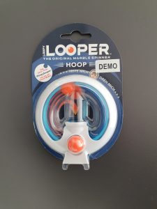 Um Loopy Looper zu spielen, muss man lediglich den Murmelkreisel von seinem Standfuß nehmen, eine der mitgelieferten Murmeln oder eine eigene mit identischem Durchmesser im Kreisel platzieren und diese dann mit einem Ruck in Bewegung setzen. Danach gilt es, durch rhythmische Bewegungen aus dem Handgelenk heraus, die Murmel auf ihrer Bahn im Kreisel zu halten, wobei man diesen in unterschiedlichen Winkeln halten und die Geschwindigkeit der Murmel variieren kann. Bei dem uns vorliegenden Loopy Looper der Version Hoop ist der zweite Schwierigkeitsgrad dann, die Bewegung so rechtzeitig zu stoppen, dass die Murmel wie bei einem Korbwurf beim Basketball in das Loch des Kreisels fällt.