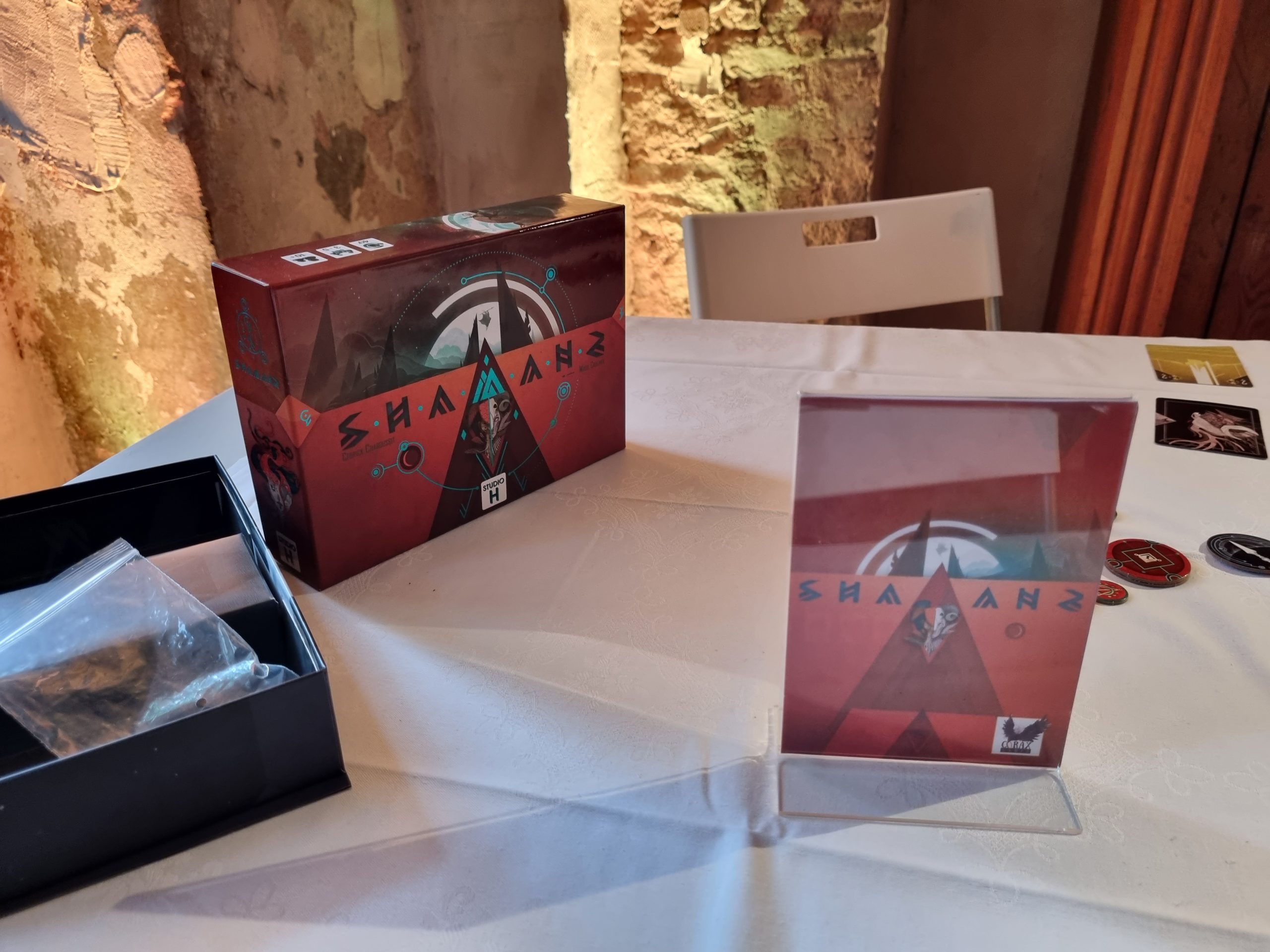 Von Corax Games darf man sich auf das rundenbasierte Stichspiel Shamans freuen, das Deduktions-Elemente bietet und auch optisch eine echte Augenweide ist. Eher als Partyspiel ist dagegen Revelations ausgelegt, bei dem es darum geht, seine Mitspieler richtig einzuschätzen.