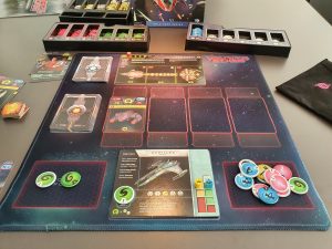 Warp`s Edge von Scott Almes ist 2020 bei Renegade Games Studios erschienen und ist ein Spiel für eine Person, bei dem der Spieler versuchen muss, das Mutterschiff einer feindlichen Alienflotte zu zerstören. Doch es gibt nur eine begrenzte Anzahl an Versuchen. Diese werden als Warp bezeichnet. Zu Beginn sucht sich der Spieler einen Starfighter aus. Hier kann er bestimmen, wo die Stärken liegen sollen: Feuerkraft, Panzerung, Wendigkeit etc. . Danach sucht sich der Spieler noch das Mutterschiff der Aliens aus, das er am Ende des Spiel besiegen muss. Die Mutterschiffe haben verschiedene Schwierigkeitsgrade und Fähigkeiten. Als Nächstes müssen nur noch die Stapel mit den gegnerischen Raumschiffen gemischt, die Tokens in den Nachschubbeutel gepackt und der Stapel mit den Spezialfähigkeiten gemischt und in Reichweite platziert werden. Wir ziehen zwei Karten von den Spezialfähigkeiten, wobei wir eine der Karten behalten dürfen und die zweite ablegen müssen. Der Ablauf des Spiels ist recht einfach. Vom Stapel mit den gegnerischen Schiffen wird die Angriffsreihe der Aliens aufgefüllt. Als nächstes benutzt der Spieler Tokens aus seinem Pool. Mit diesen Tokens kann er verschiedene Aktionen gegen die feindlichen Schiffe durchführen, wie Waffen abfeuern, Schilde aufladen oder Manöver fliegen. Gelingt es uns, ein Schiff der Aliens zu zerstören oder auszumanövrieren, ist es aus dem Spiel und kommt auch bei weiteren Warps nicht zurück. Nachdem der Spieler seine Aktion durchgeführt hat, reagieren die Schiffe der Aliens und führen ihre Aktionen aus. Wird unser Starfighter zerstört, haben wir das Spiel verloren. Im letzten Schritt zieht der Spieler 5 neue Tokens, die er seinem Pool hinzufügen kann. Somit hat er im nächsten Durchgang mehr Möglichkeiten. Sobald keine Tokens mehr im Nachschub sind, endet der Warp und wir starten einen neuen Versuch. Abhängig vom Mutterschiff, haben wir unterschiedlich viele Warps um unser Ziel zu erreichen. Das Spiel ist gewonnen, wenn das Mutterschiff zerstört werden konnte.