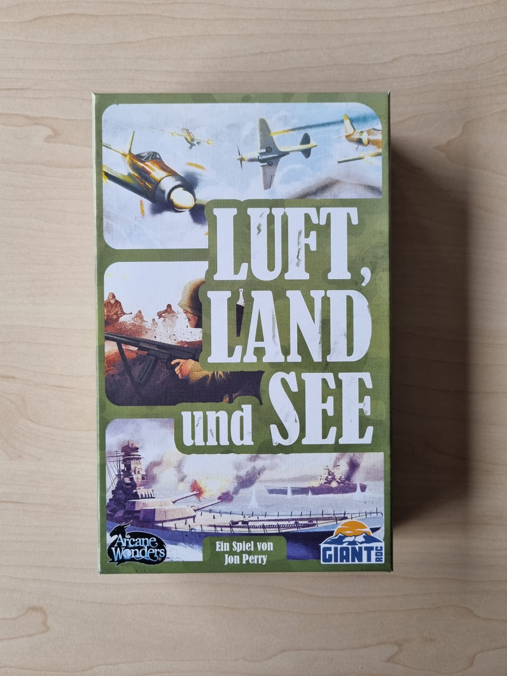 In unserem heutigen Mittwochsspecial soll es um das Zwei-Personen-Spiel Luft, Land und See gehen, auf das wir während der B-Rex Tage im September 2022 aufmerksam geworden sind. Autor des Titels, der im englischen Original bei Arcane Wonders erschienen ist und dessen deutsche Version im Herbst 2022 von Giant Roc herausgebracht wurde, ist Jon Perry. Geliefert wird das kleine Strategiespiel in einer recht kompakten Rechteckbox mit ziemlich martialischer Covergestaltung. In der Box finden wir 20 Karten, 3 Tableaus, 14 Marker und das Regelheftchen.