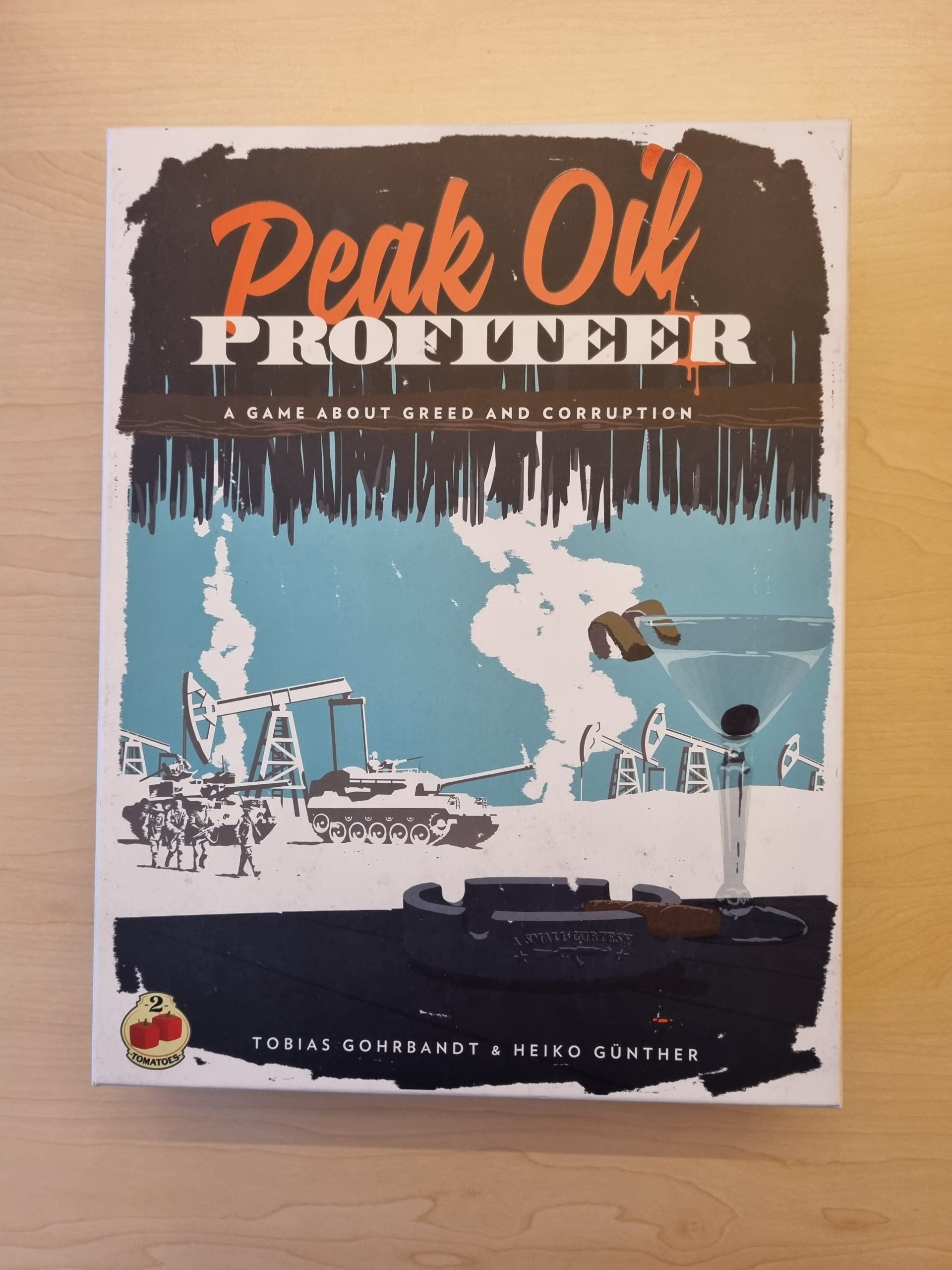 Im spanischen Girona hat der Verlag 2 Tomatoes Games seine Heimat, an dessen Stand wir auf der SPIEL `22 in Essen über Peak Oil Profiteer gestolpert sind. Mittlerweile ist der Titel, der vom Autorenduo Tobias Gohrbrandt und Heiko Günther entwickelt wurde, nun auch auf unseren Redaktionstisch gelangt, so dass wir ihn einmal genauer unter die Lupe nehmen können. Der Untertitel „A Game about Greed and Corruption“, der auf dem Cover der rechteckigen Standardbox prangt, klingt jedenfalls schon sehr vielversprechend. Öffnen wir die Box, finden wir in ihrem Inneren 74 Karten, 10 Chips, 25 Spielsteine, einen Würfel, einen Marker, den Spielplan, Spielgeld und die mehrsprachigen Regelhefte.