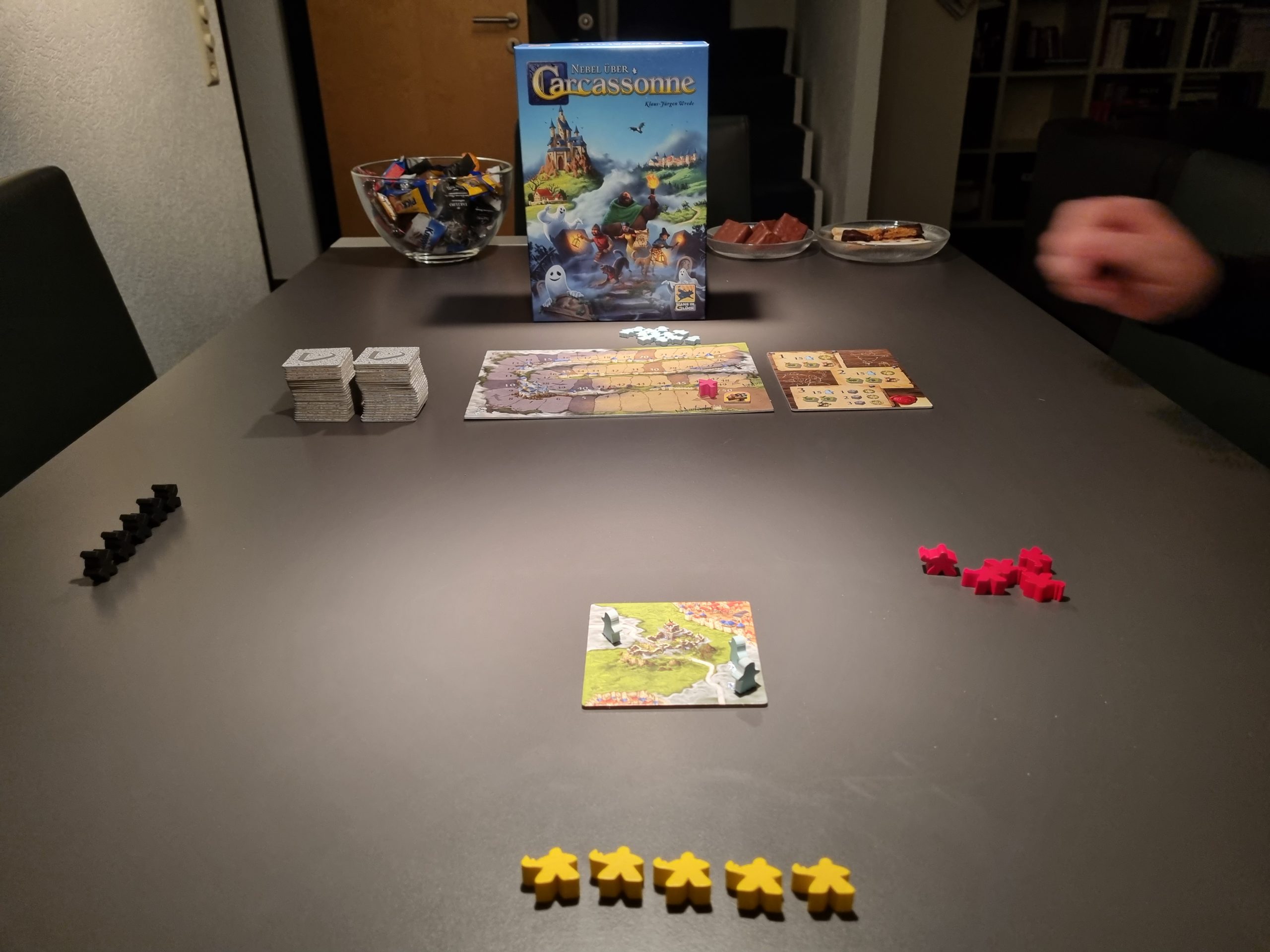 Zum Spielstart werden die Wertungstafel und die Levelübersicht, sowie die Geistermeeple bereitgelegt. Dann erhält jeder Spieler die Meeple seiner Farbe, das Startfeld wird in die Tischmitte gelegt und mit Geistermeeple bestückt. Sobald die Landschaftsplättchen verdeckt gemischt sind, kann es dann auch losgehen. Der jeweils aktive Spieler zieht, wie beim klassischen Carcassonne, ein Plättchen vom Stapel der Landschaftsplättchen und legt dieses an die vorhandenen Plättchen passend an. Dann kann er einen seiner Meeple auf eine Straße oder eine Stadt auf dem gelegten Plättchen stellen, sofern die Straße bzw. Stadt noch nicht durch andere Meeple besetzt ist. Ist auf dem Plättchen Nebel abgebildet, muss die entsprechende Zahl Geistermeeple auf das Plättchen gesetzt werden. Schließt ein Spieler in seinem Zug eine Straße bzw. Stadt ab, erfolgt eine Wertung und der Marker wird auf der Wertungstafel nach vorne geschoben. Alternativ kann der Spieler auch maximal 3 Geistermeeple von einem Plättchen entfernen. Wird ein Nebelfeld abgeschlossen, werden alle Geistermeeple in diesem Nebelfeld entfernt. Die Gruppe gewinnt, wenn sie die erforderliche Punktzahl des gewählten Levels erreicht. Sie verliert, wenn die Geistermeeple ausgehen oder der Stapel mit den Landschaftsplättchen aufgebraucht ist.
