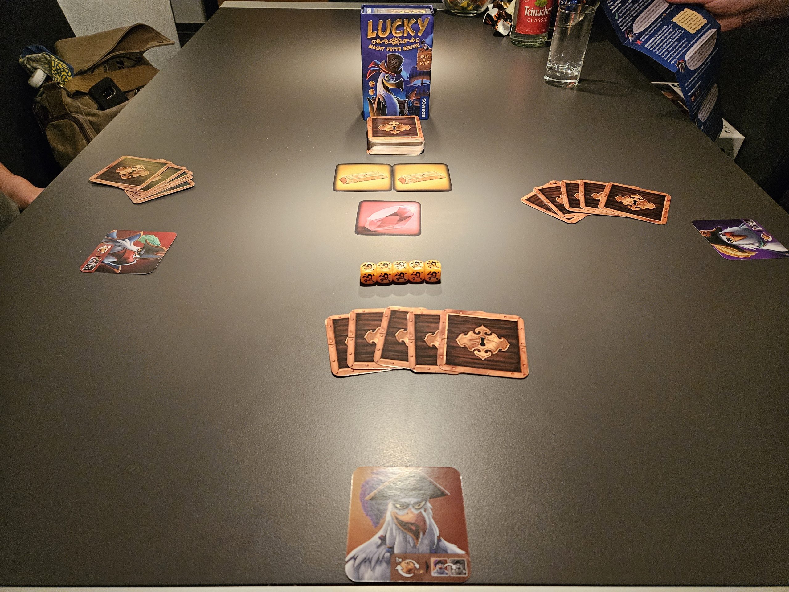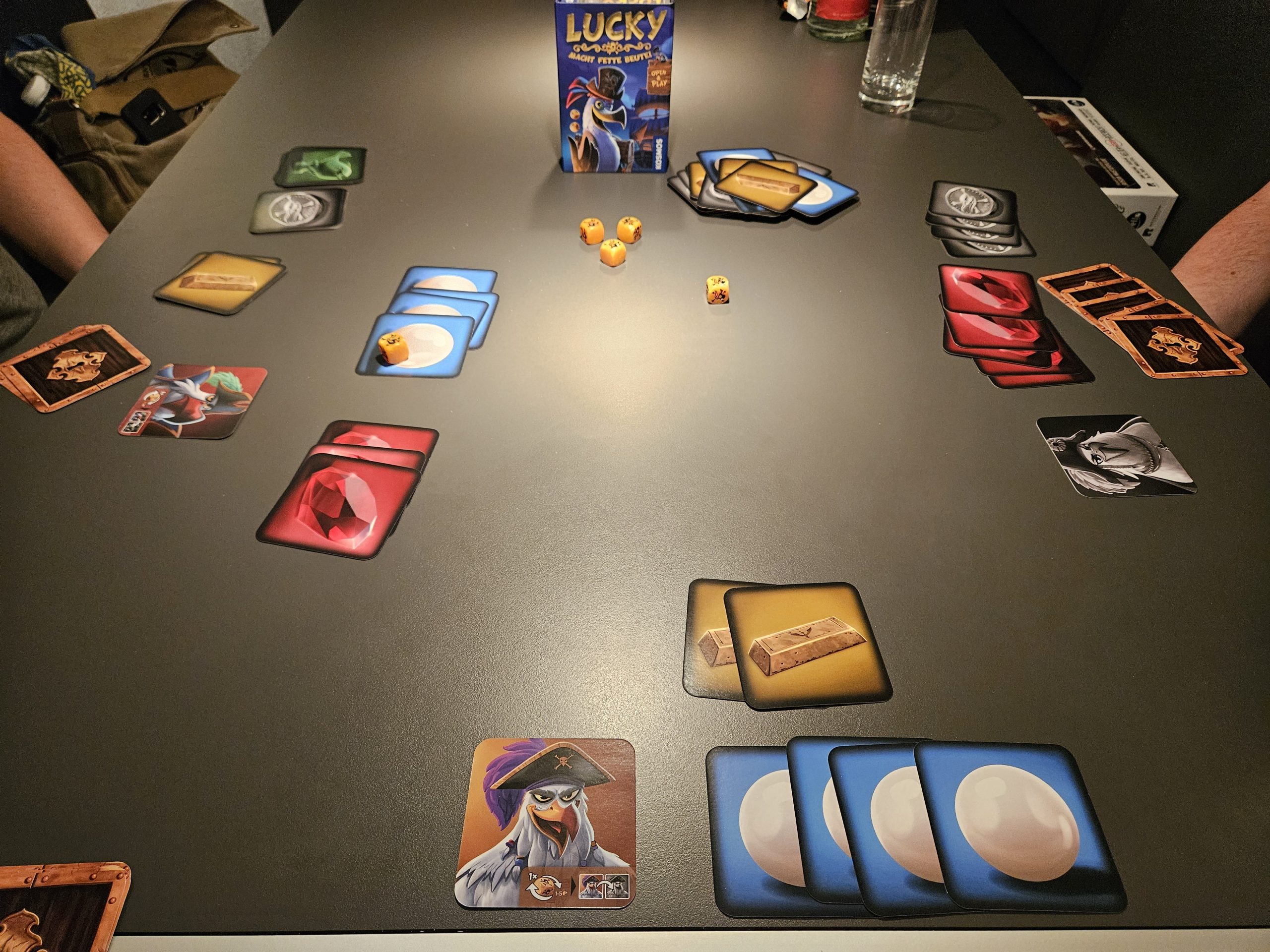 Lucky macht fette Beute ist ein sympathisches, kleines Spiel für die ganze Familie mit sehr kindgerecht gestaltetem Spielmaterial. Die Regeln sind einfach und schnell erlernt und bieten keinerlei Fallstricke. Der Glücksfaktor bei diesem Spiel ist durch das Würfeln natürlich extrem hoch, wobei es hier eher ratsam ist, auf kleinere Sets zu gehen. Je weniger Würfel man würfeln muss, desto höher ist nämlich die Chance, auch Erfolg zu haben. Allerdings besteht bei kleinen Sets natürlich immer die Gefahr, dass einem die Mitspieler diese dann wieder klauen. Von daher muss man sehen, sie möglichst schnell wieder zu vergrößern. Wir hatten mit diesem schnellen Spiel für zwischendurch jedenfalls viel Spaß. Dank seiner kompakten Abmessungen passt es zudem perfekt auch ins Reisegepäck, so dass man sich damit eine lange Zugfahrt oder Flugreise verkürzen kann.