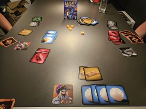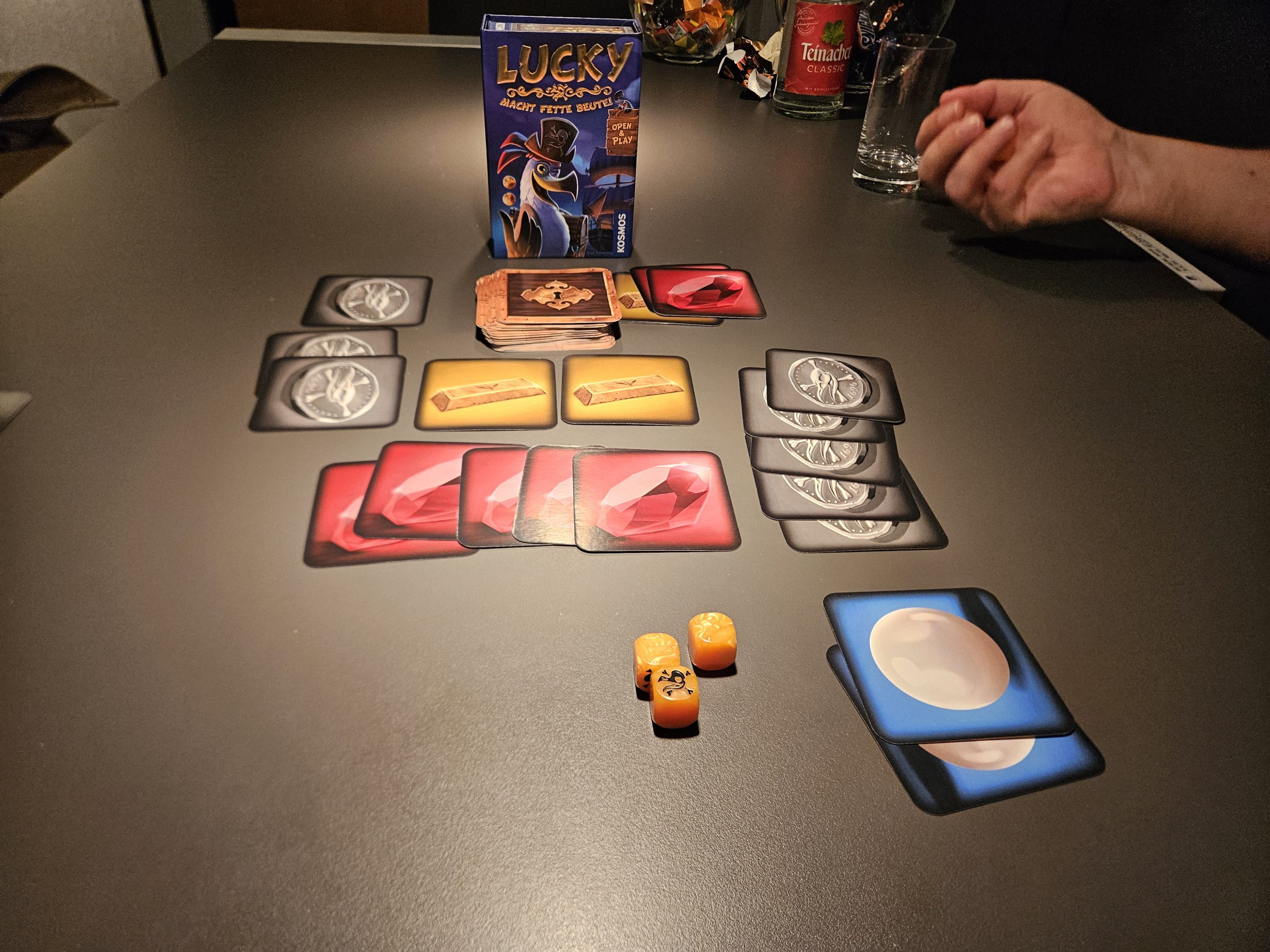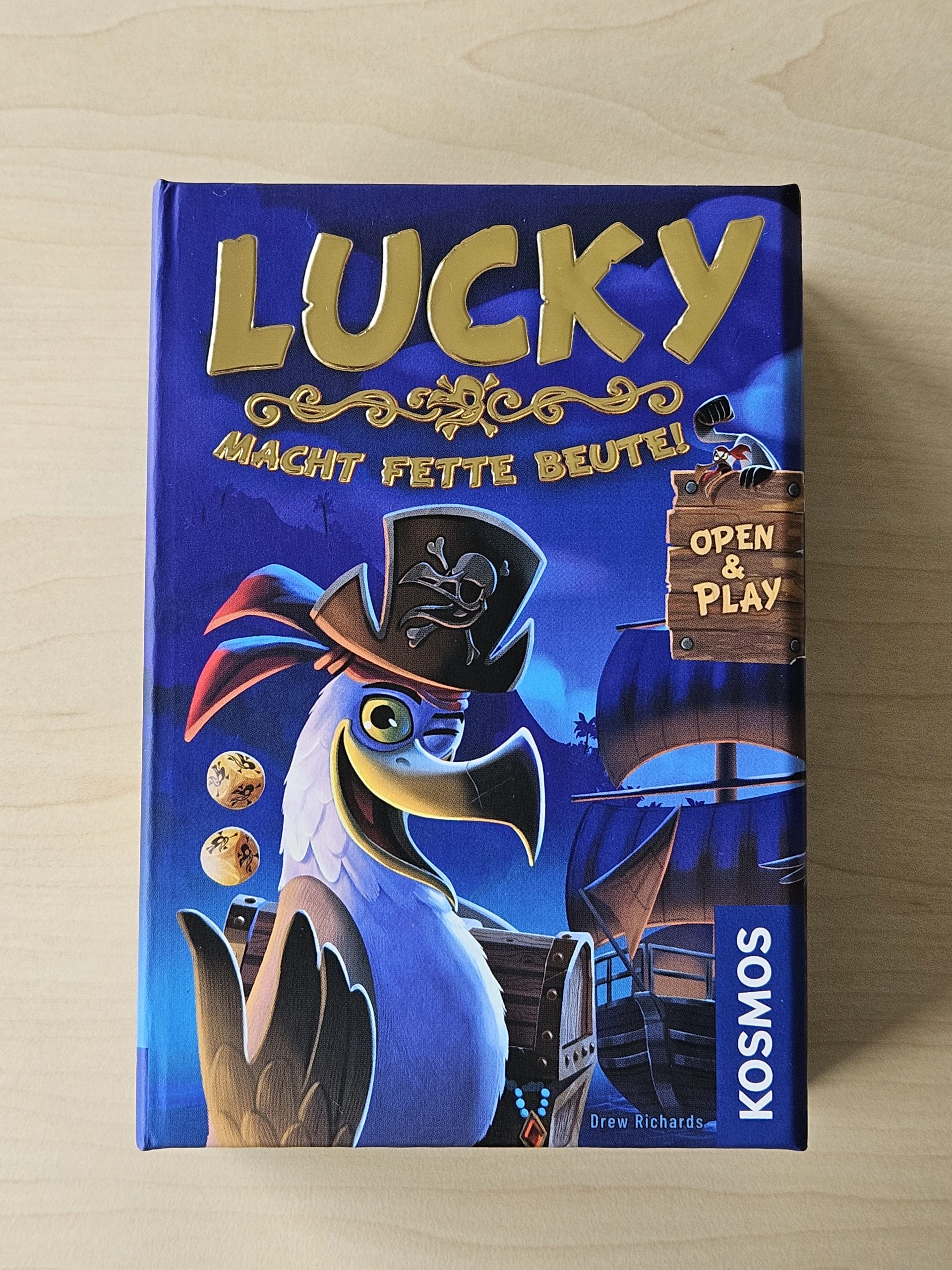 Ende Mai erreichte uns wieder einmal ein Päckchen des Stuttgarter Kosmos-Verlages. Sein Inhalt war eine der Frühjahrsneuheiten 2024, die auf der Spielwarenmesse in Nürnberg vorgestellt worden waren, und zwar das Kartenspiel Lucky macht Fette Beute. Autor dieses Titels ist Drew Richards, während das Artwork von Cyril Jedor stammt. Als Verpackung dient dem Spiel eine recht kompakte Box mit einem Klappdeckel mit Magnetverschluss. Öffnen wird sie, so sorgt in ihrem Inneren ein Pappeinleger für Ordnung beim Spielmaterial, welches sich aus fünf Würfeln, 103 Karten und dem Regelfaltblatt zusammensetzt.