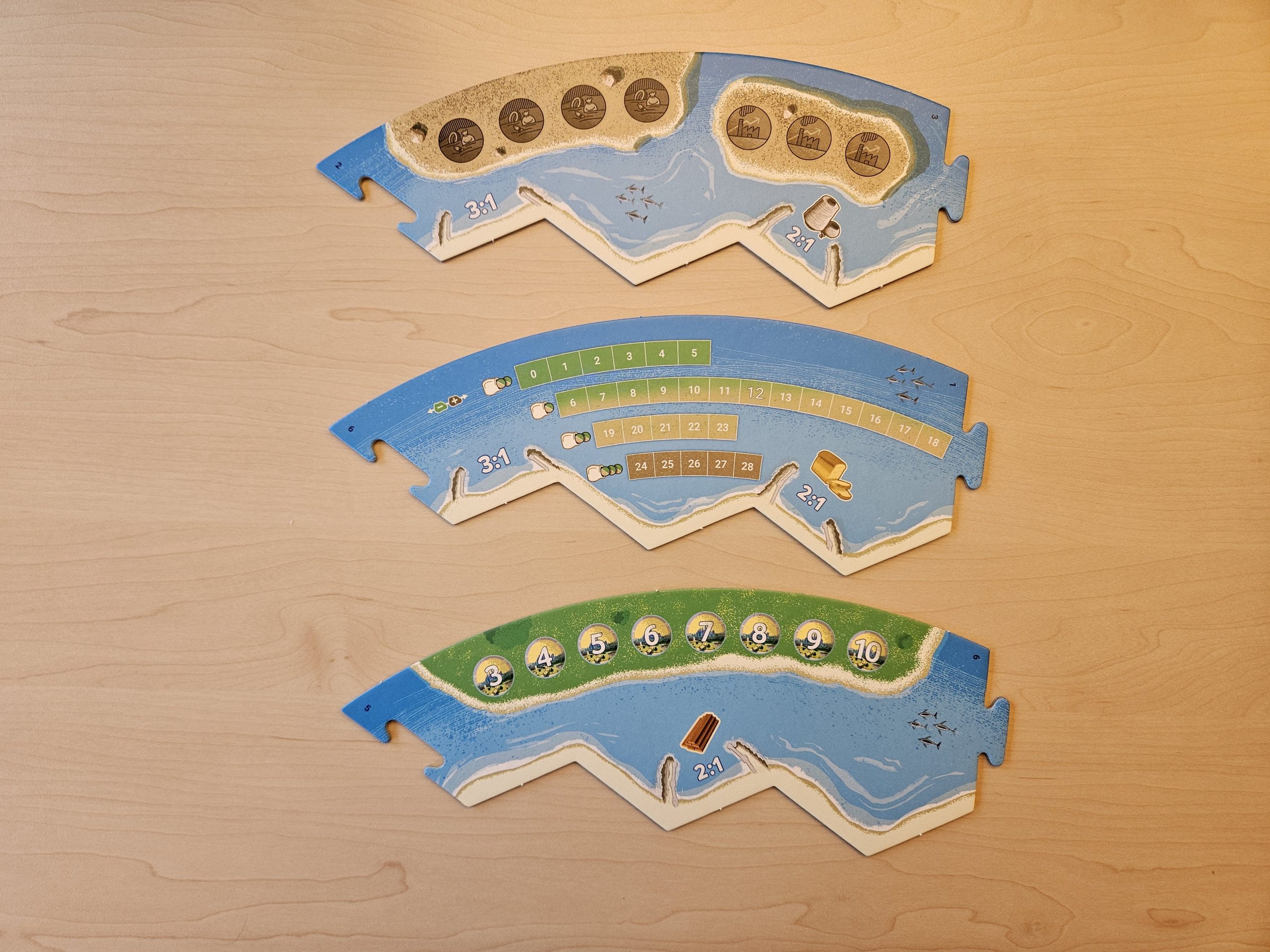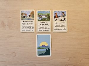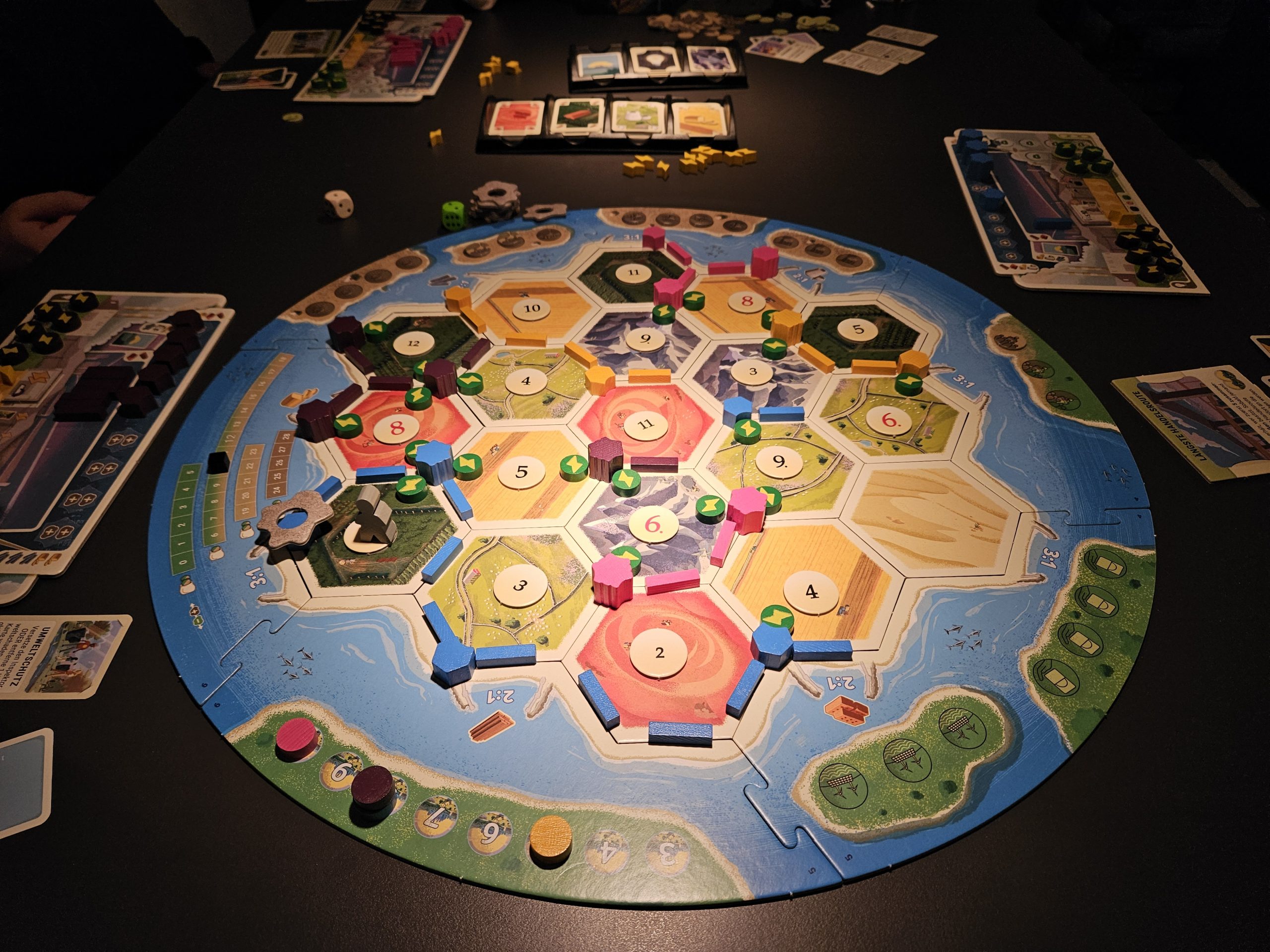 Zur Spielvorbereitung wird der Spielplan aus den Hexfeldern und Rahmenteilen gemäß Anleitung zusammengesetzt und in die Tischmitte gelegt. Die Zahlenchips kommen auf Landfelder, der Umweltinspektor auf das Wüstenfeld. Oberhalb des Spielplans werden für alle griffbereit die beiden Trays mit den Karten, die Energiemarker, die Würfel, die Sonderkarten, die Umweltschäden, sowie der Beutel mit den braunen Ereignis-Chips platziert. Anschließend erhält jeder Spieler ein Tableau und das Spielmaterial seiner gewählten Farbe. Forschungsstädte, Dörfer, Straßen, das Lagerhaus, die braunen und grünen Kraftwerke kommen auf die entsprechenden Felder auf den Tableaus. Unter die grünen Kraftwerke wird zudem noch ein grüner Ereignis-Chip verdeckt gelegt. Ist ein Startspieler bestimmt, platzieren die Spieler reihum je ein Dorf und eine Straße auf dem Spielplan und in umgekehrter Reihenfolge eine Forschungsstadt und Straße. Für jedes Landfeld, das an die Forschungsstadt angrenzt, erhalten die Spieler nun die entsprechenden Erträge sowie zusätzliche eine Forschungskarte. Haben dann alle ihren Siegpunktmarker auf die 3 auf dem Spielplan gelegt und ist der Verschmutzungsmarker auf dem zur Spielerzahl passenden Feld der Verschmutzungsleiste, kann es losgehen. In seinem Zug zieht der aktive Spieler zunächst einen Ereignis-Chip aus dem Beutel und legt ihn auf das entsprechende Feld auf dem Spielplan. Wird dadurch ein Ereignis ausgelöst, wird dieses zunächst für alle Spieler abgehandelt und die betreffenden Chips dann vom Spielplan genommen. Anschließend würfelt der Spieler mit beiden Würfeln und alle Spieler die ein Dorf oder eine Forschungsstadt angrenzend an das gewürfelte Landfeld haben, erhalten den jeweiligen Ertrag bzw. bei einer Forschungsstadt zusätzlich noch eine Forschungskarte und bei einem Kraftwerk auf dem betreffenden Landfeld noch einen Energiemarker. Sollte der Spieler eine 7 würfeln, müssen alle, die mehr als sieben Handkarten, bzw. wenn sie ein Lagerhaus haben bei mehr als zehn Handkarten, die Hälfte abwerfen. Der Spieler muss anschließend den Umweltinspektor auf ein Landfeld seiner Wahl stellen, das so keine Erträge mehr liefert. Zudem darf er eine der Handkarten eines Spielers, der angrenzend an dieses Feld ein Dorf oder eine Forschungsstadt hat, klauen. Nun kann der aktive Spieler entscheiden, ob er mit seinen Handkarten Straßen oder Dörfer bauen, Dörfer in Forschungsstädte umwandeln oder Entwicklungskarten kaufen will. Zudem kann er in seinem Zug maximal ein Kraftwerk bauen. Ist es ein grünes Kraftwerk kommt der Ereignis-Chip unter dem Kraftwerksmarker in den Beutel. Hat er die passenden Ressourcen nicht, kann er mit Mitspielern handeln und/oder Energiemarker nutzen, um sich die notwendigen Ressourcen zu verschaffen. Sind der Siegpunkt- und der Verschmutzungsmarker entsprechend angepasst worden, ist der nächste Spieler am Zug. Die Partie endet, sobald ein Spieler mindestens zehn Siegpunkte erreicht hat mit dessen Sieg.