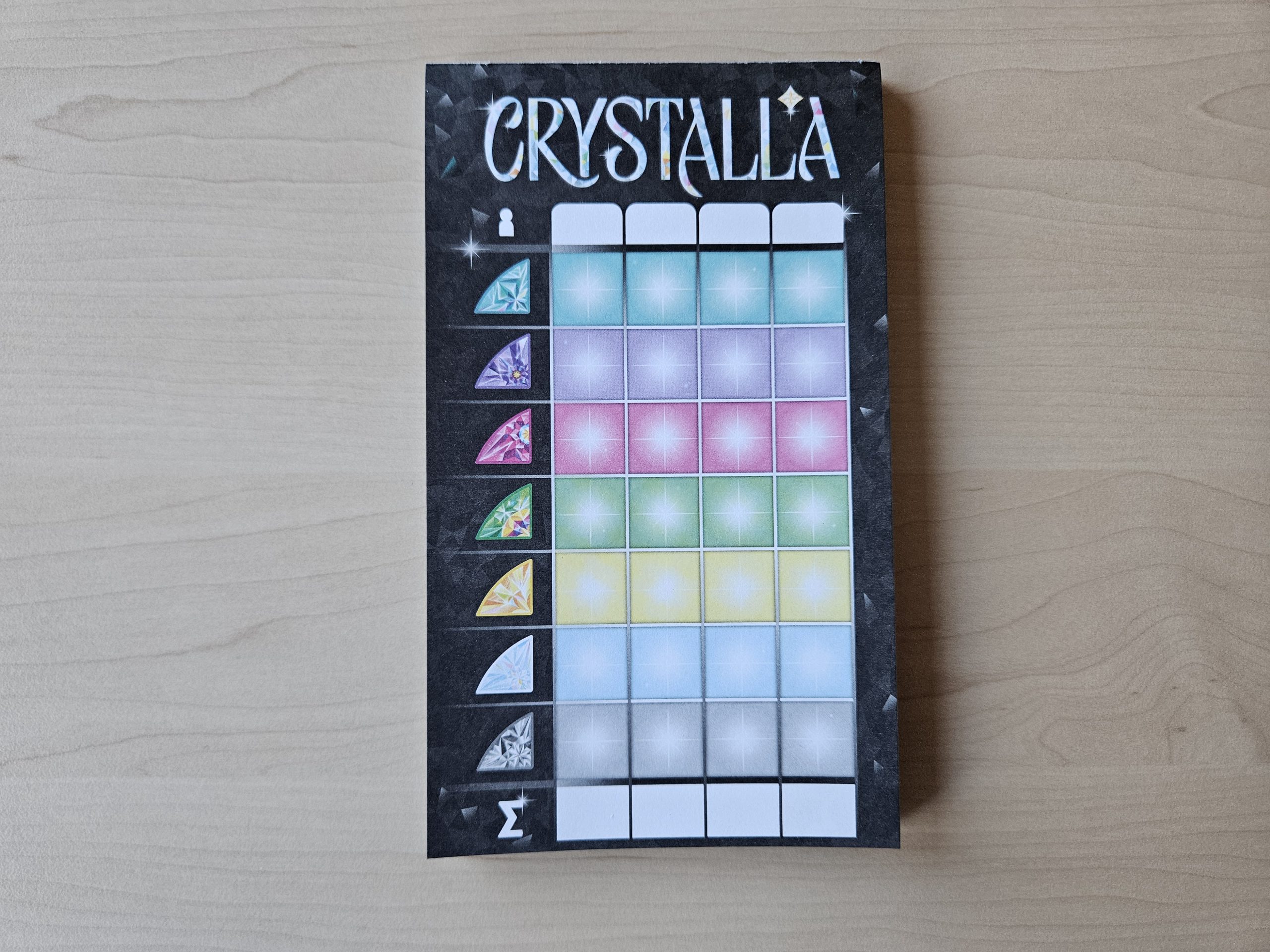 Zu den Frühjahrsneuheiten des Jahrgangs 2025, welche Schmidt Spiele auf der Spielwarenmesse in Nürnberg vorgestellt hatte, zählt auch das Familienspiel Crystalla, das uns in die Welt der Kristalle entführt. Der Titel, der von dem Autorentrio Yoel Sayada, Renaud Libralesso und Pierrick Libralesso entwickelt wurde, kommt dabei in einer quadratischen Standardbox daher, in deren Innerem ein Pappeinleger für Ordnung beim Spielmaterial sorgt. Dieses wiederum besteht aus 90 Karten, 12 Steinen, 36 Plättchen, vier Übersichten, einem Block, vier Tableaus und dem mehrsprachigen Regelheft.