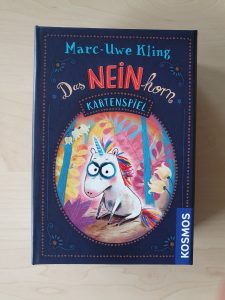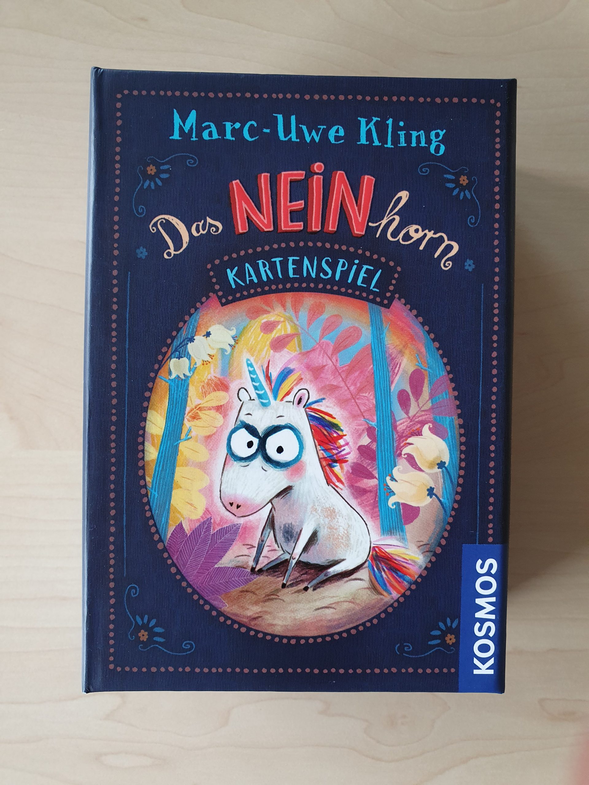 Unter den Frühjahrsneuheiten des Stuttgarter Kosmos Verlages ist uns ein sympathisches, kleines Kartenspiel für Kinder ins Auge gestochen, das wir uns einmal näher anschauen wollten. Es trägt den Titel Das NEINhorn und wurde vom Autor Marc-Uwe Kling entwickelt. Das namensgebende NEINhorn ziert denn auch das Cover der kompakten Klappdeckelbox mit Magnetverschluss, in der wir sicher verstaut das Spielmaterial finden. Dieses besteht aus 120 Karten, 20 Markern, 2 Erweiterungen und dem Regelfaltblatt.