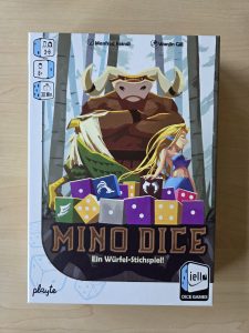 Die Spiele des französischen Iello-Verlages finden sich ja schon seit einigen Jahren im Deutschland-Vertrieb von Hutter. Dieses Jahr haben die Franzosen zur Spielwarenmesse in Nürnberg das Würfel-Stichspiel Mino Dice des Autors Manfred Reindl vorgestellt, welches Thema unseres heutigen Blogbeitrages sein soll. Geliefert wird Mino Dice in einer kompakten Rechteckbox mit dem namensgebenden Minotaurus auf dem Cover. Nehmen wir den Deckel ab, so finden wir im Innern sechs Sichtschirme, 36 Würfel, einen Beutel, einen Wertungsblock und das Regelheft vor.
